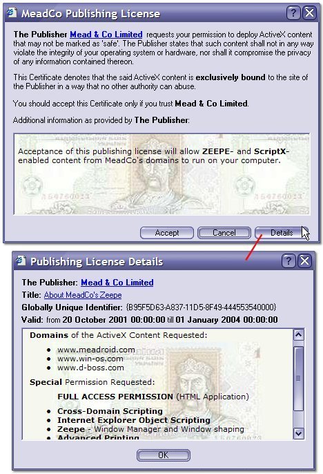 When a valid license is accepted, any denoted ActiveX content will be bound to the domain it is being served from, as requested. If a page from any other domain happens to reference the same ActiveX control(s), it will obey the standard Internet Explorer security rules as defined by IE Security Zones (see MSKBQ182569 for technical details). This behaviour is provided for by MeadCo's custom implementation of Internet Explorer Security Manager.